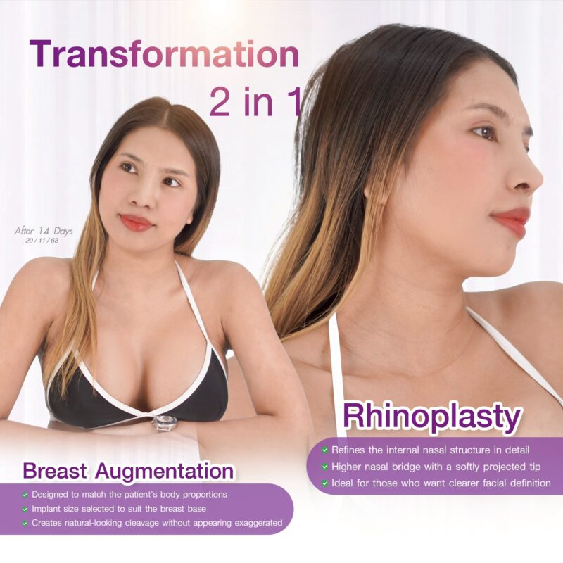 Breast augmentation improves body curves and upper body proportion, while rhinoplasty refines facial structure and definition. When these two elements are balanced together, the patient’s overall presence becomes more confident and refined.