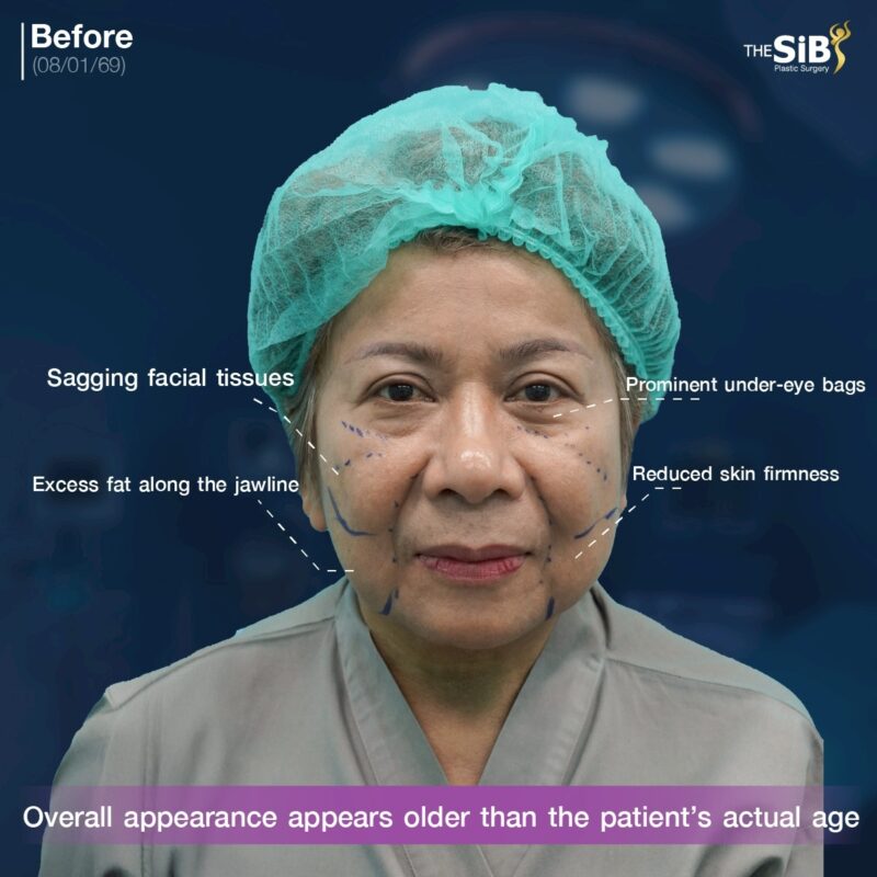 This case involves a 60-year-old patient who visited the clinic with several concerns related to facial aging. Over the years, she noticed that her face had begun to look less defined. The jawline appeared softer, excess fat had accumulated around the lower face, and the skin no longer felt as firm as it once did. In addition, the under-eye area had become puffier, with visible eye bags that contributed to a tired and aged appearance.